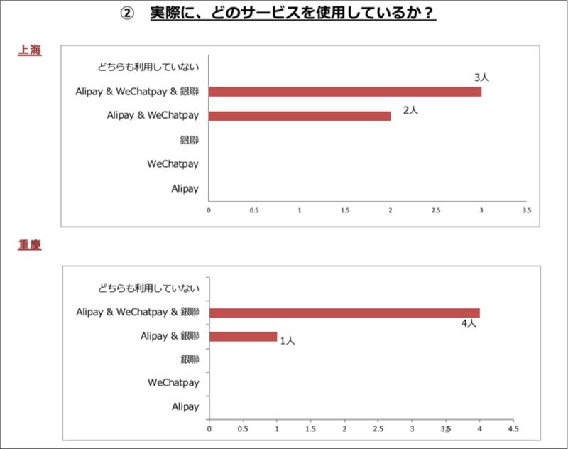 実際に、アリペイ、ウィーチャットペイを自身のスマートフォンにダウンロードしているをかたずねたところ、上海、重慶共に、全員がスマホ決済サービスを持っており、さらには1人を除く9人がアリペイとウィーチャットペイの両方を持っていました。