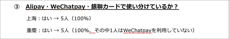 現地調査に協力してくれた10人にアリペイ、ウィーチャットペイ、銀聯カードを使い分けているかたずねたところ、100%が使い分けていると回答しました。
