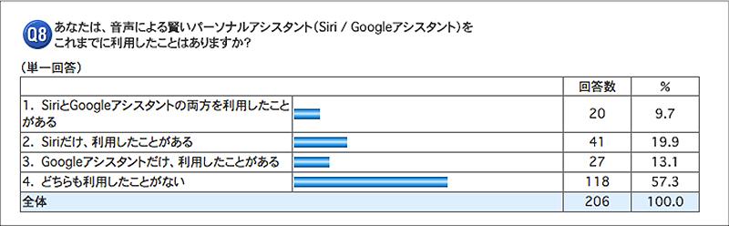 北海道、東京都、愛知県、大阪府、福岡県在住の20代〜50代の男女200人に、スマートフォンの音声アシスタントSiriまたはGoogleアシスタントを利用したことがあるかの問いに対し、どちらか一方、または両方を利用したことがあると回答したのは全体の42.7%という結果に。