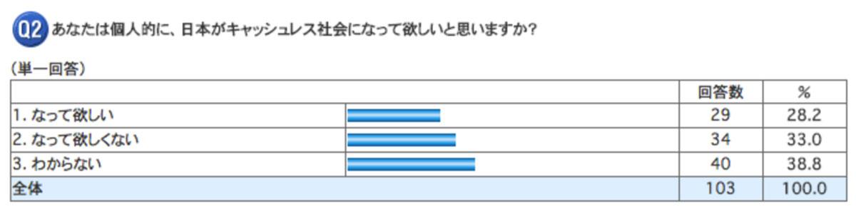- 実際にキャッシュレス社会を待ち望んでいる人は28.2%で、「なって欲しくない」人は33.8%だった。「なって欲しくない」人が「なって欲しい人」を上回った結果となりました。
