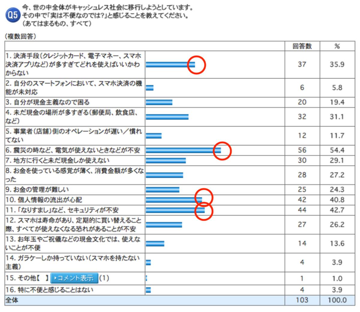 - 「キャッシレス社会で不便だと思うこと」について1位が「震災時の不安」、2位が「なりすましの不安」、3位が「個人情報流出の不安」だった。