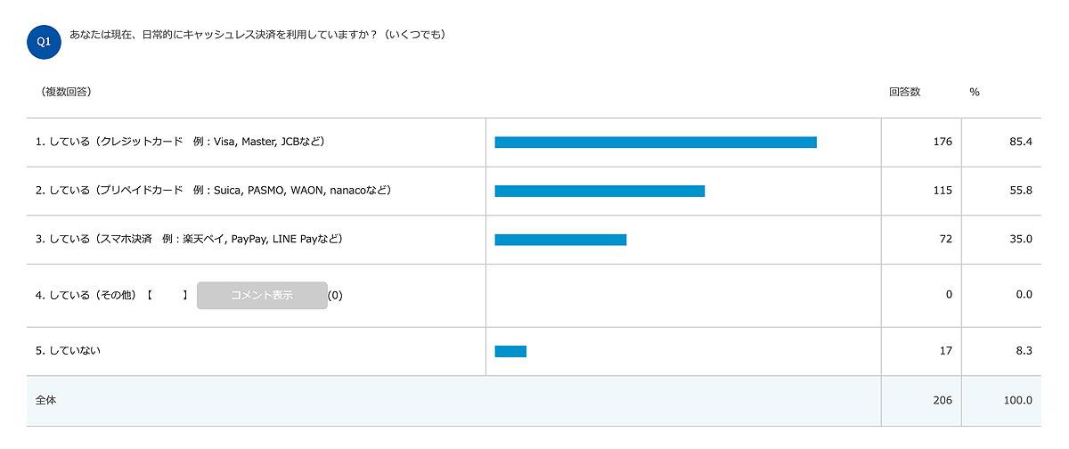 - 現在利用している決済サービスで一番多かったのはクレジットカードで全体の85.4%だった。そのあとは「プリペイドカード」55.8%、「スマホ決済」35%と続いた