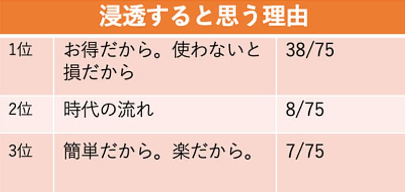 「浸透すると思う」と回答した理由として一番多かったのが、「お得だから。使わないと損だから」で、「浸透しないと思う」と回答した理由として多かったのが「高齢者は使えないと思う」「現金主義者が多いから」という結果になりました。この結果を受け、SSL所長の安田は「キャッシュレスはすでに浸透し、日常的に現金よりキャッシュレスで支払っているキャッシュレス派は現金派の3倍であることがわかりました。しかし実際には『まだキャッシュレスは浸透していない』、または『浸透するかわからない』と思っている人が多いことがわかります。キャッシュレスで支払える場所がまだまだ限定されていることが消費者にそう思わせる要因の一つでしょう。インフラが整わない背景には手数料の問題が避けては通れません」と話します。