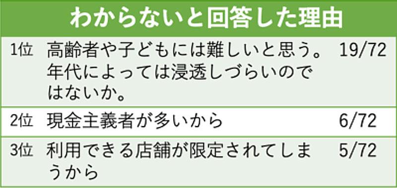 - 増税時のポイント還元によってキャッシュレスは浸透するかどうかについては、「浸透すると思う」と回答した人は全体の36.7%で一番多く、「わからない」と回答した人は35%、「浸透しないと思う」28.6%だった。