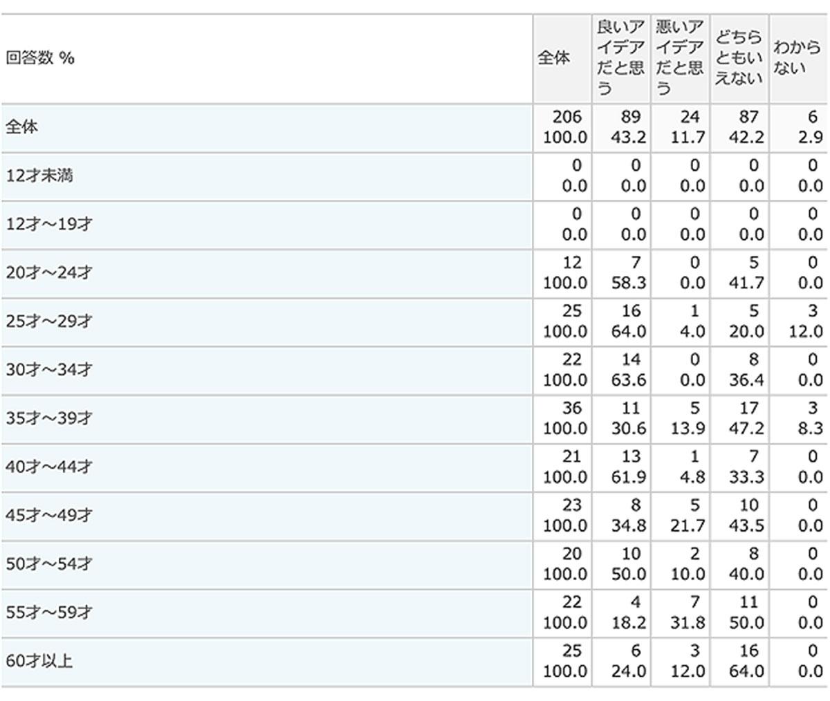 「良いアイデアだと思う」、「悪いアイデアだと思う」と回答した人を年代別で見てみると、「良いアイデアだと思う」と回答した人は、若干20〜30代に多く見られるものの、さほど顕著でもなく全年代が好意的に思っていることがわかりました。「悪いアイデアだと思う」と回答したうちの半数は50代以上でした。