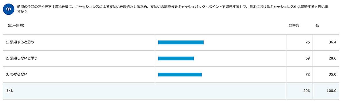 【前問の今回のアイデア「増税を機に、キャッシュレスによる支払いを浸透させるため、支払いの増税分をキャッシュバック・ポイント還元する」で日本におけるキャッシュレス化は浸透すると思いますか?】の問いに、「浸透すると思う」と回答した人は全体の36.7%で一番多く、「わからない」と回答した人は35%、「浸透しないと思う」28.6%と続きました。それぞれがほぼ横ばいと結果に。