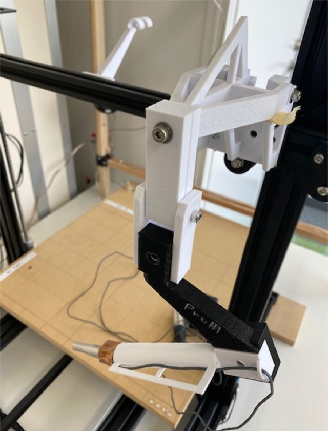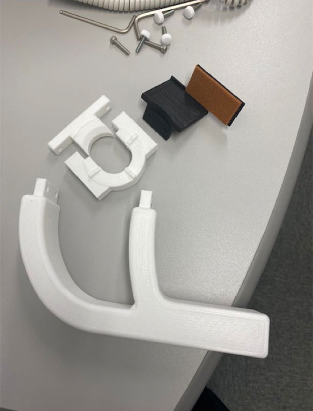 スマートサウンドラボでは、音の実験用の設備を使って様々な実験を行っている。プラスチック筐体に内蔵されたスピーカーからの音が距離や場所によってどのように拡散・反射してスマホに届くか、環境ノイズの大きさにより音通信がどのように影響を受けるかなどを無響箱と呼んでいる実験用の設備の中で測定する。測定用にマイクをリモートで動かして自動測定する設備を自作している。写真1のようなもので、マイクを固定するパーツを設計しラボにある3Dプリンターで作成する。以前は木を加工して作っていたが、3Dプリンターが普及してからはとても便利に活用している。社内slackに大阪大学のフェースシールドを欲しがってる友人の話を書き込むと、池田研究員が3パターンのフェースシールドを出力してくれ、友人の病院で使われている。