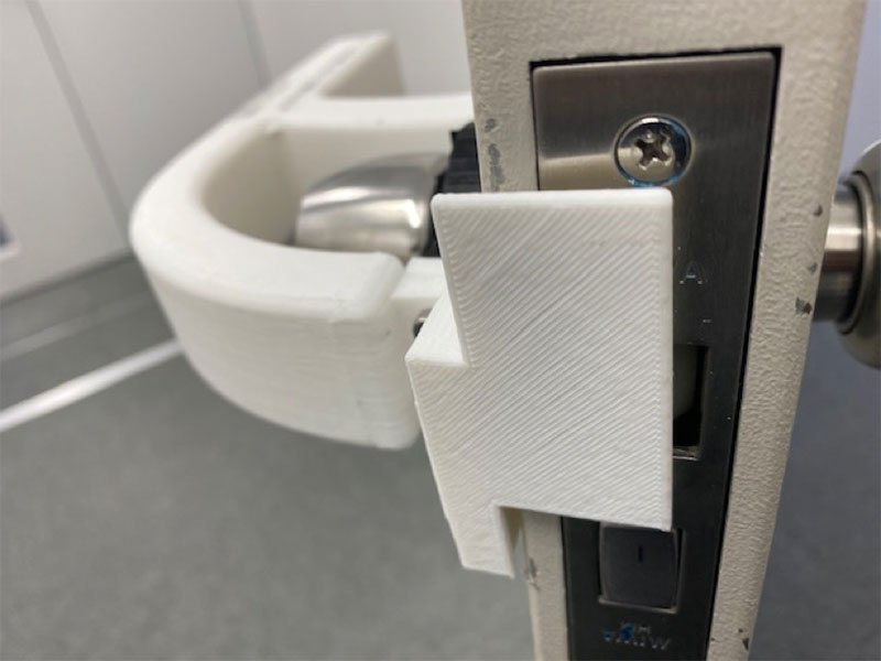 弊所の入り口のドアは重い鉄の扉で丸ノブのため、べったりドアノブを持って回して引っ張ったり押したりして開閉する必要がある。まず試したのは、市販のゴム製で丸ノブにはめて使うパーツで、これは丸ノブに触らず回転できるため押してドアを開ける場合に大変便利なものであったが、引くときには変形して開かないためNG。次に考えたのはドアのノッチ(ドアが閉まる部分の壁側に飛び出して引っかかる部分)を飛び出なくする事。これは、消しゴムを良い形に工作して詰める事で出なくなり、ドアを押すときには、ドアノブを触らなくても良くなった。しかし、これもドアを引いて開ける時には触る必要がある。重いドアなのでやっかいだ...腕がはいって腕で開けられるようなレバーをドアに取り付けられないか?池田研究員に、そういうのあると便利なんだけどなあとつぶやいた所、次の日に出社するとなんとすばらしい作品が出来ているではないか。