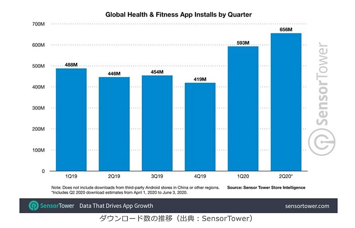 米国の調査会社SensorTowerによると、新型コロナウイルスの影響で、健康意識が高まり、健康管理やフィットネス用のアプリのダウンロードが増加しているといいます。その数なんと世界で約6億5600万回!前年同期比47%UPで過去最高を記録したそうです。