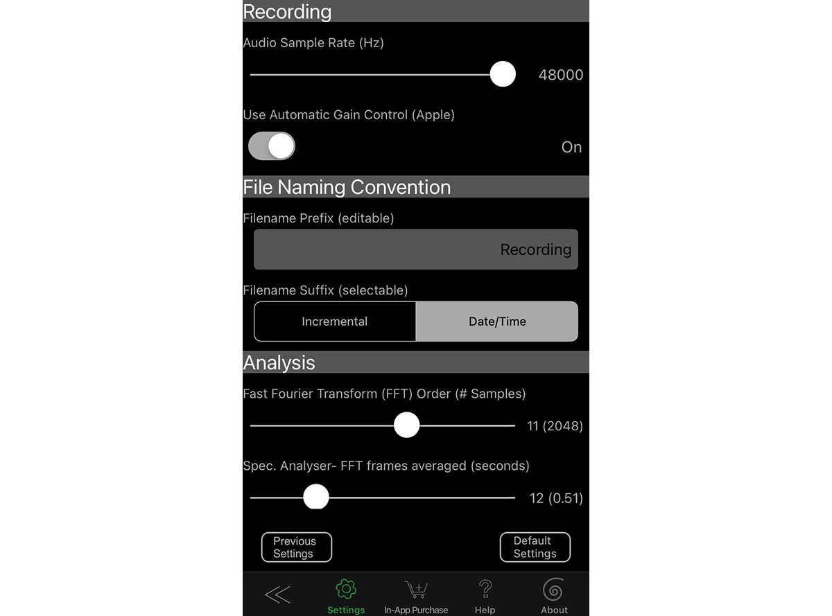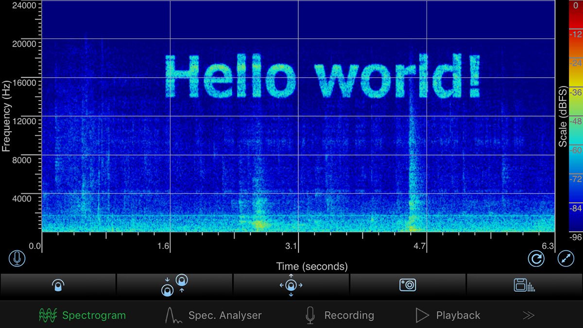 iOS用アプリ「SpectrumView」をダウンロードし、設定を添付のようにしていただいた上で音声を聴かせると、「Hello World」の表示を実際に見ていただけるはずです。