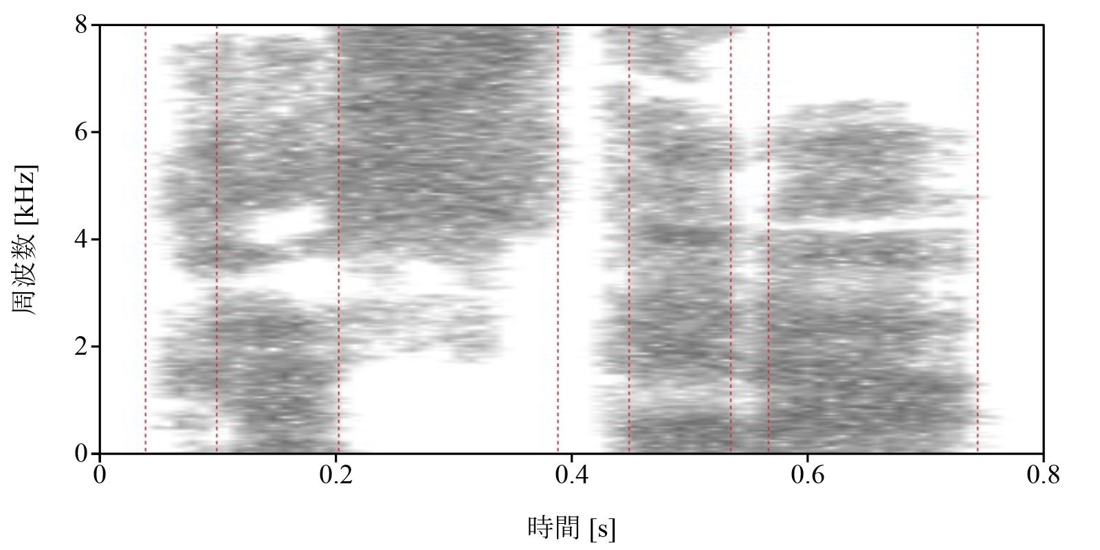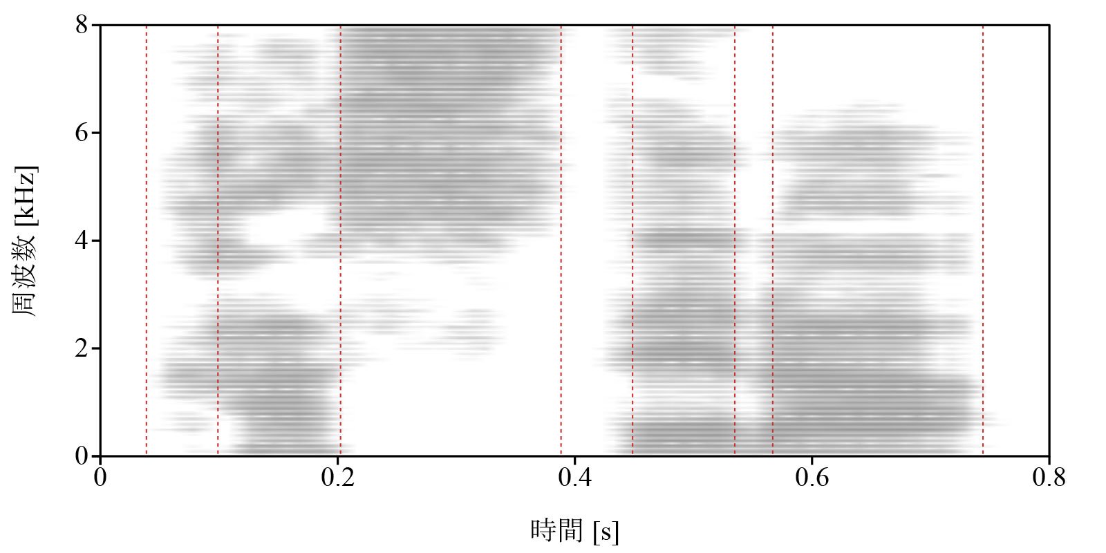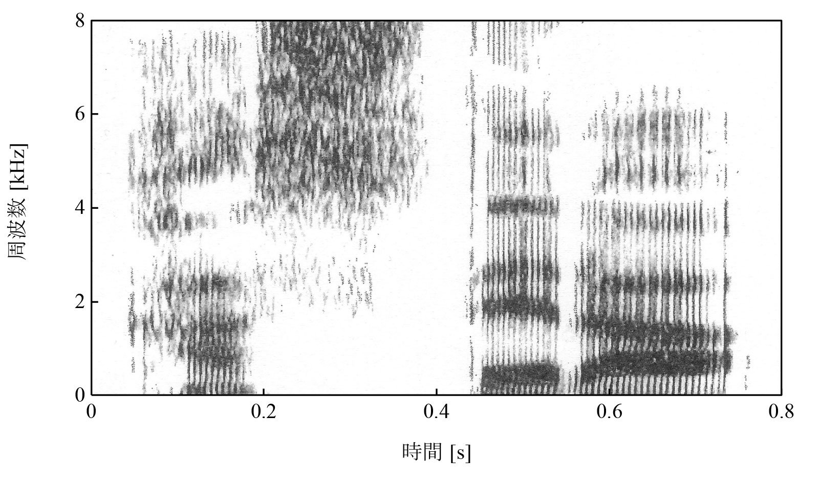 図5に示すように、この音声のスペクトログラムを観察してみると、倍音構造が見られず、これがささやき声のように聞こえる理由になっています。ただし、/su/のような無声区間では、こちらの音声のほうが、本来の人間の音声に近いことがおわかりいただけるのではないでしょうか。