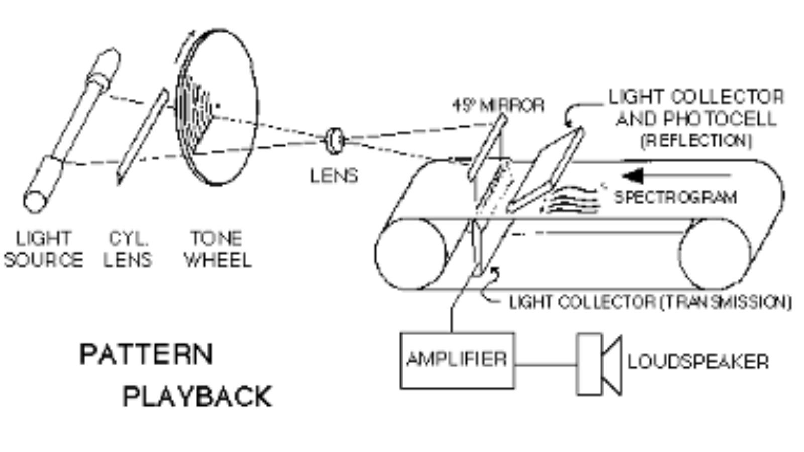 スペクトログラムを音声に変換する試みは、1940年代、米国ハスキンス研究所で考案されたパターンプレイバックにさかのぼることができます。図2に示すように、パターンプレイバックは、スペクトログラムを光学的に読み取り、音声を再生する装置でした。