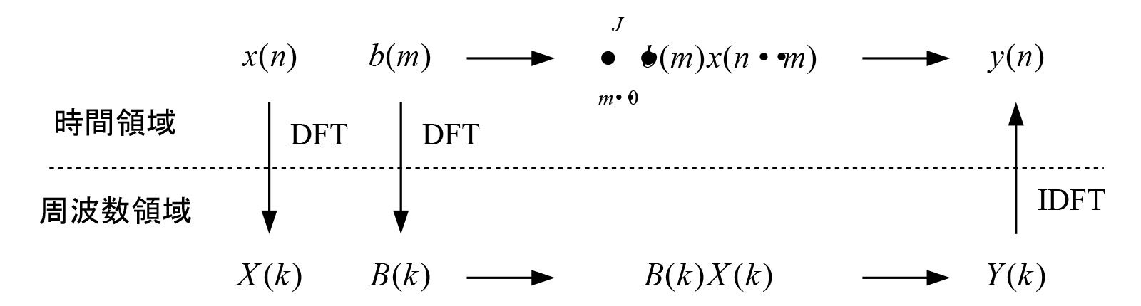 こうしたしくみをコンピュータで実現するには、DFTフィルタリングがひとつのアプローチになります。図3に示すように、DFTフィルタリングは、時間領域におけるたたみ込みは周波数領域における乗算に等しいことを利用してフィルタ処理を行います。ここで、x(n)を声帯音源、b(m)を声道フィルタとすると、これらのたたみ込みによって生成されるy(n)が音声になります。なお、声道フィルタは周波数領域ではB(k)と表されますが、これがスペクトログラムにほかなりません。