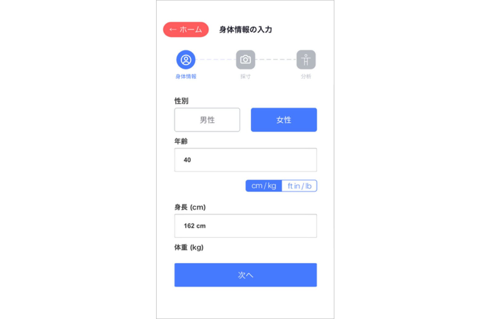 ユーザ登録後、性別や年齢、身長・体重といった情報を入力し、撮影に写ります。「自分で撮影する」「誰かに撮影してもらう」の選択肢があり、「自分で撮影する」を選択すると、さらに「ポーズ検出自動撮影」と「カウントダウン撮影」があります。「ポーズ検出自動撮影」を選択し、数分で正面と側面の撮影は終了。もちろん洋服を着たまま撮影が可能です。採寸結果は合計24ヵ所と、かなり細かく採寸してくれます。ただ、お店に1人で行って採寸(撮影)するのは大変だと思いますので、事前に採寸して、そのデータをお店とシェアすることをお勧めします。